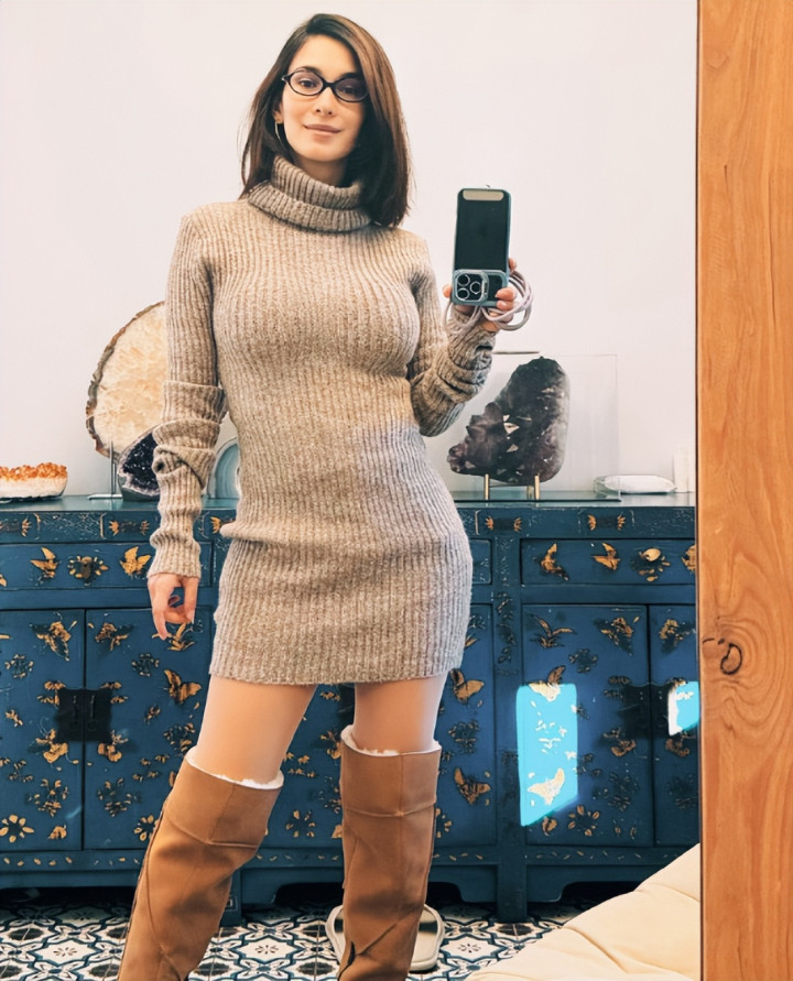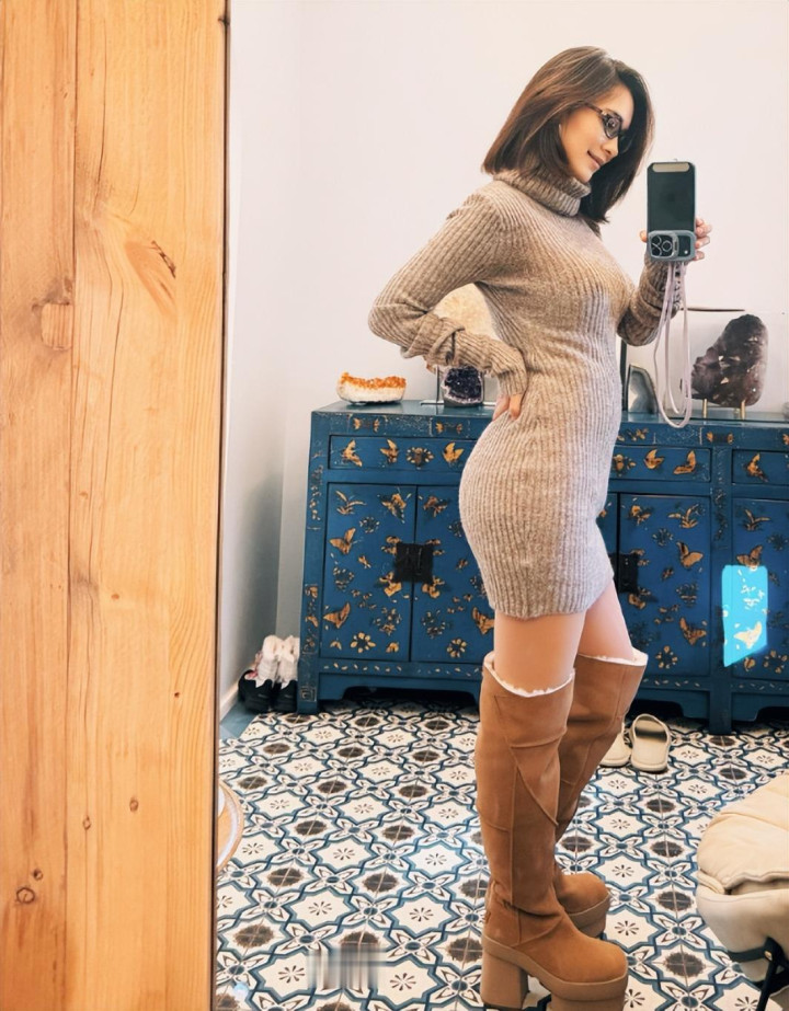 照片里的她染着一头金黄色头发,戴着黑框眼镜,身穿燕麦色高领紧身毛衣裙搭配棕色长筒靴,侧身对着镜子自拍时,S形曲线一目了然。