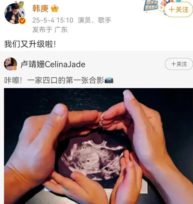 5月4日,俩人突然发B超照,配文“咔嚓!一家四口的第一张合影”,韩庚转发“我们又升级啦”,全网炸锅,原来二胎真的已经在路上了!