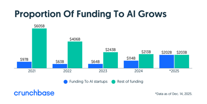 根据Crunchbase的2025年终数据,AI领域在全球范围内吸引了超过2000亿美元的融资,几乎吃掉了全球风险投资总额的50%。