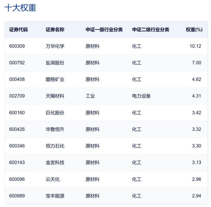 细分化工指数的前10大重仓股合计占比约45%,重仓万华化学、盐湖股份等大市值龙头。持仓股中也覆盖众多化工细分领域龙头。