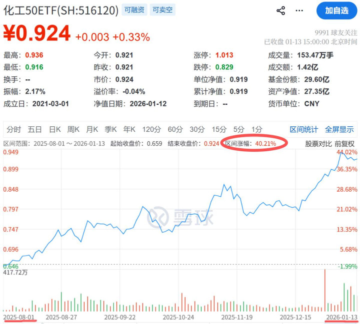 从我去年正式推荐化工板块算起,去年8月1日至今,5个多月时间,化工50ETF(516120)已经涨了40%!