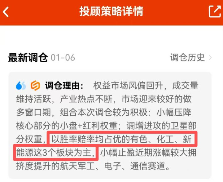 因为,我重点关注的一个基金投顾1月6日最新调仓时,进一步提高了化工仓位。给到的原因是“胜率赔率均占优”。