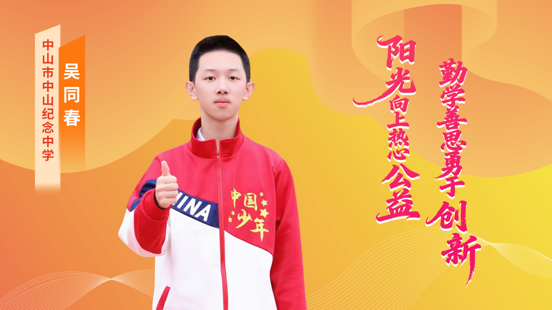 吴同春同学以信息学为支点,以全面素养为臂膀,以家国情怀为动力,在伟人故里的沃土上,奋力书写着无愧于时代的青春答卷。他的成长故事,是“新时代好少年”精神内涵的生动体现,激励着更多南粤青少年为科技强国梦想而不懈奋斗。