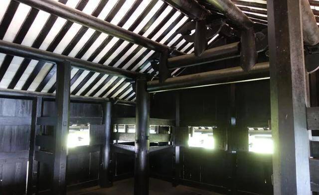 不少人第一眼看到真武阁,只会觉得这是一座普通的三层古楼,飞檐翘角,形制规整,看不出特别之处。它通高十三米二,底层从柱中到柱中测量,面阔十三米八,进深十一米二,乍看是面阔三间、进深三间的格局,和南方很多明清楼阁没有太大区别。可只要往细里看,就会发现它的用柱方式非常反常,底层外围一圈是檐柱,内部前后各有四根金柱,一共八根,直接贯通到上层檐下,到了中层和上层,这八根柱子就成了檐柱,也就是说,底层那一圈檐柱,更像是一圈回廊立柱,真正承担整座楼主体重量的,是中间这八根通柱。这种做法直接决定了真武阁与众不同的外形与内部空间,也为它最神奇的结构,埋下了伏笔。